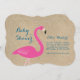Um guião elegante de fita e um flamingo rosa brilhante num fundo de areia da praia, decoram este convite de chá de fraldas, fazer-o perfeito para um chá temático de verão, vara ou flamingo.