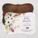 Flores e penas pintadas à mão maravilhosamente enfeitam este simples e elegante convite ao Noivado para aquele casal amoroso da natureza. Inverter em madeira escura.