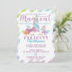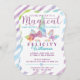 Bonito, brancas e mágicas florais e listras arco-íris convite para chás de bebês unicórnios apresentando um belo cavalo unicórnio de cor d'água vestindo uma arco de ouro rosa e falso, e adorno com flor e folhas de cor d'água floral. O convite para o chá de fraldas apresenta o título "Você é Convidado a um Chá de fraldas Mágico" com a palavra "Mágico" em um belo e caprichoso estilo de escrita. O convite para o chá de fraldas unicórnio é colorido em um esquema de cor pastel arco-íris que cria um aspecto macio e mágico. Um padrão de listras de aquarela arco-íris é incorporado na frente e atrás para criar uma aparência realmente mágica e adorável. Todas as ilustrações contidas neste convite para chá de fraldas unicórnio são obras de arte originais desenhadas à mão pela Moodthology. Você pode personalizar o tamanho do texto, a cor do texto, a fonte e o layout para sua preferência de design pessoal.