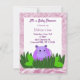 Um hipopótamo doce na grama e plantas. Uma borda de pontos cor-de-rosa acentos este convite para chás de fraldas. Personalize com todas as suas próprias informações conforme desejado.
