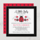 Uma pequena joaninha está a caminho! Convite para chá de fraldas de ladybug vermelho e preto. A parte de trás do convite é decorada com um padrão de bolinhas. Personalize-o para o seu chá de fraldas. Projetado para você pelo Blackberry Boulevard.