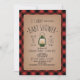Um convite de chá de fraldas com uma ilustração de uma lanterna de campismo verde. Personalize o texto. O fundo é vermelho e a xadrez preta de lenhador inspira o padrão de xadrez de búfalo.