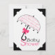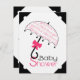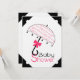Um convite com cantos antigos de fotos em preto, tanto na frente quanto no verso. O design consiste de um guarda-chuva preto e branco com um padrão de "bebê" de texto rosa e um arco rosa-quente na alça. O texto abaixo diz "Chá de fraldas" em preto e rosa. Personalize o texto do lado oposto com detalhes do evento. Procure variações desse convite e itens correspondentes, como postagem na categoria "Bebê" da Paperie de Jill.