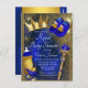 Cartaz de convite para chá de fraldas do príncipe azul real com coisas fofinhas de azul real e príncipe dourado em um lindo fundo azul real e ouro. Este convite para o chá de fraldas príncipe real é facilmente personalizado com os detalhes do seu evento.