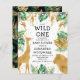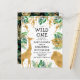 Este convite para chás de fraldas, chamado "selvagem", contém folhas falsas de ouro (girafa, leão e macacos), folhagem dourada e selva verde, e uma aspersão de confete de ouro sobre fundo branco. Adicione o nome da futura mãe e os detalhes do chá em texto preto. Um padrão de folhagem em verde e dourado em fundo preto decora a parte de trás da carta.