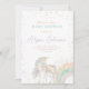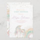 Um belo convite para chás de fraldas de unicórnio com arco-íris e sotaques de ouro falsos.