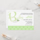 Chá de fraldas convite com a palavra "Baby" em texto verde claro e sotaque de borboleta fofo. Limite inferior das bolinhas verdes. O convite é adequado para a menina ou para o garoto. Os convites são fáceis de personalizar e são completos com envelopes e sua escolha de papel.