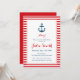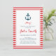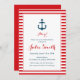 Convite para Chás de fraldas moderno com um fundo listrado vermelho e ilustração de âncora.