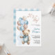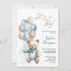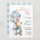 Convite de chá de fraldas de moço azul de Trendy com ursinho de pelúcia giro com balões de pastel azul e castanho, texto "é um menino" e padrão de xadrez azul pastel no fundo. Itens correspondentes disponíveis.