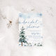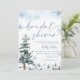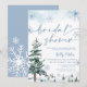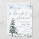 Chá de panela da Terra Maravilha de inverno. Convite azul com pinheiros e flocos de neve.