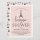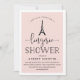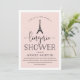 Oh la la! Convide convidados para uma chá de lingerie para que a noiva esteja no estilo chic parisiense. Nossos elegantes convites para chás cor-de-rosa e lingerie preta com ilustração em torre Eiffel e tipografia negra moderna, mas caprichosa. Cartões revertem para nosso padrão romântico em Paris com minúsculos croissantes, macarões, pássaros, rosas, bicicletas e torres Eiffel.