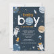 Houston, temos um bebê! Contagem para explodir! Convide seus amigos e família para um chá de fraldas temático no espaço sideral. Este design apresenta planetas, estrelas, foguetes, astronautas, galáxias, satélites e muito mais!
