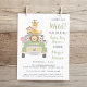Um belo convite para o chá de um bebê amigo do orçamento, com uma ilustração de animais do zoológico bebê (leão, elefante, zebra, macaco e girafa) empilhados em um veículo safari e "Está prestes a se tornar selvagem" em tipografia divertida, e "Chá de fraldas" e o nome da mãe na coordenação da escrita verde do exército. Você pode personalizar facilmente os detalhes do chá, mudar o texto "É um menino!" no veículo, e adicionar a data do chá na placa de licença, ou deixar o vazio. Este papel semirbrilhante do orçamento é semelhante em peso ao papel fotográfico. Uma versão tradicional de estoque de cartão grosso também está disponível (mensagem para o link).