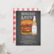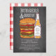 Hambúrgueres modernos e divertidos e hambúrgueres de chalkboard e casais de churrasco de cerveja convite para chá de casamento com uma garrafa de cerveja com um enorme hambúrguer colocado sobre um fundo preto de chalkboard e um pano de checker vermelho correspondente para um toque especial.