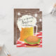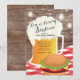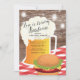 Convite exclusivo para um chá de i do casal com uma caneca de cerveja em uma toalha de mesa vermelha com um hambúrguer em fundo de madeira.