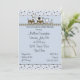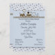 Nosso pequeno trem está carregando animais recheados de uma girafa e elefante em uma linha de trilhos de trem. O plano de fundo é de todos os tons de pontos poka em azul, com espaço para as informações de convite do chá na frente e atrás.