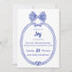 Uma crista azul com uma fita desenhada à mão no topo é a principal característica deste convite ao chá de fraldas. A crista está aberta, revelando detalhes do evento do chá de fraldas. A fita está amarrada em um arco no topo da crista. Adicione mais detalhes à parte de trás em impressão branco e um fundo azul alegre. Personalize todos os detalhes com um clique fácil.
