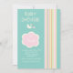 Este convite para chás de fundo, giro e lacrimogêneo, com uma borda de listras de cor pastel, apresenta uma cegonha e uma nuvem rosa para um nome ou data.