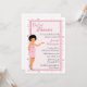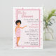 Convite para chá de menina na moda, com gráficos bonito de flores cor-de-rosa, em um quadro branco, ao redor de uma área de texto rosa pálido. Gráficos animados de uma chic mãe afro-americana para decorar o lado esquerdo do convite. O texto em preto e rosa está pronto para personalizar o evento do seu chá de fraldas. Adorável convite para a mãe ser amada.
