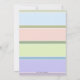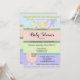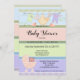 Um convite para chás de fraldas bonito e neutro, com designs listrados e pastel, com figuras de desenho animado de roupas de bebê e ursinho de pelúcia em uma ameixa.