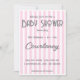 Este elegante convite para o chá de fraldas apresenta um charmoso fundo rosa e listrado branco, perfeito para celebrar as mamães a serem. O design inclui detalhes personalizáveis, como nome, data, hora, local e informações de registro. Ideal para criar um evento memorável para qualquer mãe esperada.