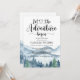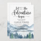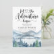 Que a aventura comece o convite para chás de fraldas de aquarelas com florestas e montanhas paisagem selvagem com tipografia de escrita de caligrafia com coração no meio. Consulte o conjunto de cheios deste design, com materiais e suprimentos de festas correspondentes em: https://www.zazzle.com/collections/forest_adventure_baby_shower-119311648144421112