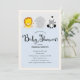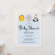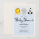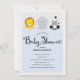 Este convite para chás de fraldas apresenta animais de zoológico de bebês - um leão, elefante, e uma zebra sentada sobre uma caixa azul clara que guarda os detalhes do chá de fraldas. Gráficos ©Prettygrafix.