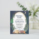 Convite à apresentação de chás de fraldas rústicos, orçamental, que inclui uma ilustração fofa de animais florestais com a tenda a acampar nas montanhas e na floresta, uma camada de estrelas de ouro e lua num céu noturno e "Aguardas de Aventura" e o nome da futura mãe num roteiro azul escuro da meia-noite. Personalize facilmente os detalhes do chá.