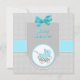 Convite de chá de fraldas quadrado na moda feito em azul aqua, com texto de cinza personalizado pronto para personalizar. O verso do convite é feito em uma cinza clara e padrão de bolinhas branca, com gráficos doces de um bebê feiticeiro azul aqua e um arco brilhante com aspecto de cebola azul aqua. Personalize o texto da cinza escura, para o seu chá de fraldas.
