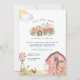 Adorável convite para chás de fraldas temáticos de fazenda com animais de exploração, um celeiro e impressão de gingham azul.