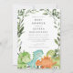 Convide seu convidado com nossos elegantes e modernos dinossauros. O convite para chás de fraldas apresenta verde eucalipto garland e dinossauros aquosos. Personalize com seus detalhes de chá de fraldas em layout simples e fonte elegante de estilo manuscrito.