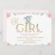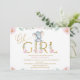 Chamada de Chá de fraldas de Elefante Floral Rosa Rosa, Elefante doce e elegante convite para o chá de fraldas com alguns peões cor-de-rosa arranjos florais e alguma folhagem, uma falsa palavra de ouro e ilustração de elefante fofo. Um código QR está atrás.