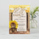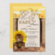 Um convite de chá de fraldas rústico com um ursinho de pelúcia sobre um fundo com madeira e burlap, girassol e aves estilizadas. Bonita celebração no estilo country.