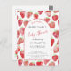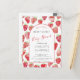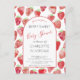Convite para chá de fraldas doce de morango e morango, de cor branca e moderna. A parte traseira contém texto correspondente e mais morangos para ajudar a cutenza. Personalize o texto para se adequar à sua celebração. Arte original de Nic Squirrell