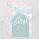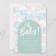 Design de bebê moderno apresentando bolinhas de cor de água azul, rosa e verde-claro com um arco verde mostrando suas informações de festas. Visite o nosso compro para ver toda a nossa coleção do Oh Baby