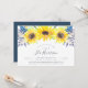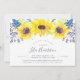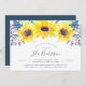 O convite para chá de fraldas floral chic do país apresenta uma borda superior de girassóis de cor d'água, minúsculos botões azuis de marinho e folhagem verde. Personalize com os detalhes do seu chá de fraldas no moderno roteiro escrito à mão e nas letras serif tradicionais. Convites de chuveiro de bebês neutro em gênero inverso a azul-porto rico.