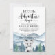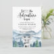 Que a aventura comece o convite para chás de fraldas de aquarelas com florestas e montanhas paisagem selvagem com tipografia de escrita de caligrafia no meio, e uma fofa de bebê de aquarela fofa no fundo do convite.