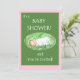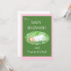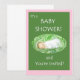 Um Cartão de Convite para Chá de fraldas para uma nova menina, com um bebê dormindo e uma inscrição branca em um fundo verde escuro, borrado de rosa.