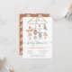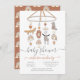 Convites modernos e bonitos para Bebê-Bebê. Scandinávia excelente com animais da floresta, raposa, urso, veado, lobo, arco-íris, pompa, montanha e nuvens penduradas em um celular. Esquema de cor neutro para ser um menino ou uma menina. Terra cotta, cinza azul empoeirada e branca.