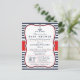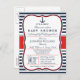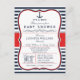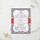 Convite náutico elegante para chá de fraldas em faixas azuis marinhos, padrão riscado. Apresenta cores azuis, brancas e vermelhas do marinho com elementos de design formal de âncora e vintage.