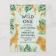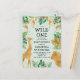 Este convite para chás de fraldas, chamado "selvagem", contém folhas falsas de ouro (girafa, leão e macacos), folhagem dourada e selva verde, e uma aspersão de confete de ouro sobre fundo verde-claro. Adicione o nome da futura mãe e os detalhes do chá em texto preto.