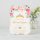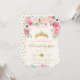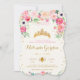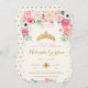 Apresente a sua nova princesa com este charmoso convite de Chá de fraldas. Uma tiara coberta de ouro cercada por um quadro de flores de floresta de jardim rosa e reluz de ouro.