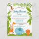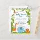 Este cartão-postal de chá de fraldas bonito apresenta um elefante, girafa, limur, macaco pendurado numa vinha, e um leão relaxando à sombra de galhos verdes e folhosos. Personalize com todas as suas informações de chá de fraldas com este texto de tendência. Você pode alterar a cor e o estilo da fonte, conforme desejar, clicando no botão Personalizar mais.
