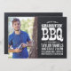 convite de festas legal de churrasco de graduação rústica com tipografia vintage angustiada sobre fundo chalkboard falso. Adicione a sua foto de mais velho e detalhes de festa de formatura com espaço no vazio para ver fotos e texto adicionais no verso. Clique em Personalizar para adicionar mais fotos e texto, editar fontes e cores para criar um anúncio e convite de festas de graduação exclusivos.