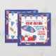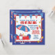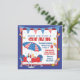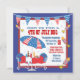Convite de churrasco patriótico vermelho, branco e azul do dia 4 de julho com estrelas e listras, foguetes, fogos de artifício, faixa de bandeiras e um conjunto de pátio ao ar livre com guarda-chuva e a mesa posta para os itens do seu piquenique. Perfeito para o 4 de julho, uma festa após uma eleição ou qualquer festa patriótica! Ilustração desenhada à mão por McBooboo