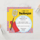Este convite para churrascos de cor brilhante tem um fundo amarelo com uma faixa de cheques vermelhos na parte inferior. Uma luva vermelha e um gráfico de espátula estão no lado esquerdo com um grande círculo branco abrindo para o texto. Este convite pode ser personalizado para qualquer tipo de barbeque ou cookout.