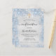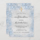 Fundo metálico prateado falso decorado com pó de brilho falso azul e uma cruz dourada. Personalize e adicione um nome e detalhes da festa. Letras de cor preta.