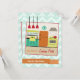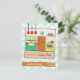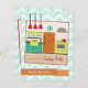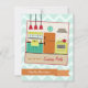 Um convite de festas de cozinhar com ilustração na frente de uma cozinha inspirada retroativamente decorada com um esquema de cor azul-turquesa, amarelo, vermelho e laranja. Personalize o texto na frente e atrás. O fundo é azul claro com ziguezague.