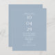 Um moderno design de convite para casamento, com orçamento minimalista, com sua data especial e detalhes de casamento, em tipografia clássica e chic, em um fundo azul empoeirado. Projetado por Thisnotme©