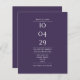 Um moderno design de convite para casamento, com orçamento minimalista, com sua data especial e detalhes de casamento definidos em tipografia clássica e chic em um fundo roxo. Projetado por Thisnotme©